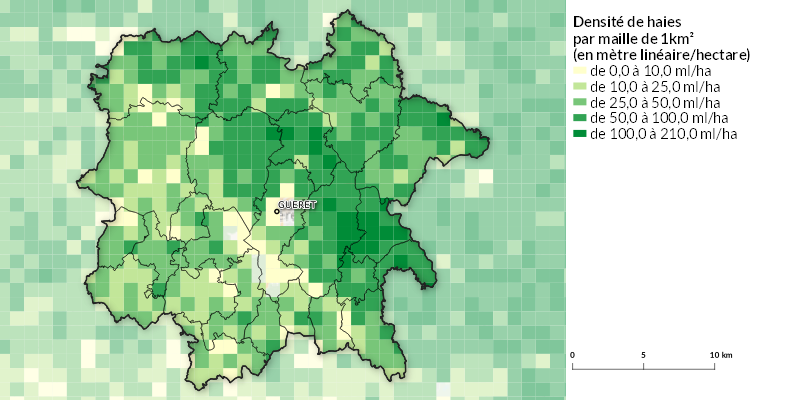 La densité de haies moyenne sur l’intercommunalité est de 48.49 ml/ha (mètres linéaires par hectare), soit 2339.78 km de haies au total.