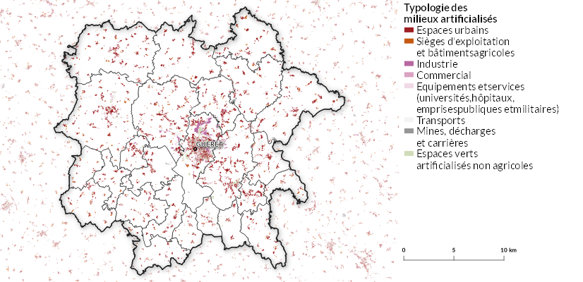 Ces espaces correspondent aux zones urbanisées, industrielles ou commerciales, à celles aménagées pour les sports et les loisirs, aux réseaux de transport (routes, voies ferrées, parking), aux mines, carrières, chantiers, aux espaces verts (parcs).