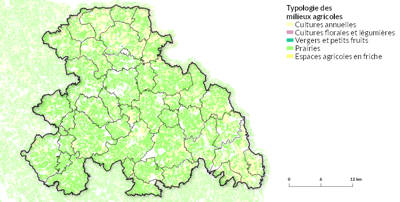 des zones de plaines largement utilisées par des grandes cultures (plus de 1 million d’hectares sur le territoire - majoritairement du blé et du maïs)
