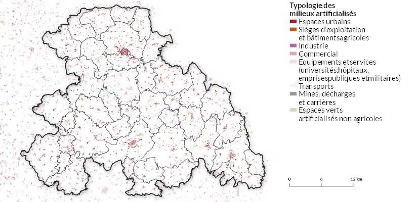 Ces espaces correspondent aux zones urbanisées, industrielles ou commerciales, à celles aménagées pour les sports et les loisirs, aux réseaux de transport (routes, voies ferrées, parking), aux mines, carrières, chantiers, aux espaces verts (parcs).