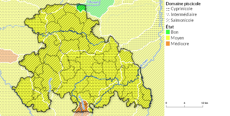 Le réseau hydrographique et son peuplement de poissons sont analysés selon le « contexte piscicole ». Le principe du découpage des cours d’eau en contexte piscicole est le suivant : dans chaque unité, une population de poissons doit pouvoir accomplir l’intégralité de son cycle vital (reproduction, croissance…). On distingue ainsi, en fonction du type de poissons, trois types de peuplement :