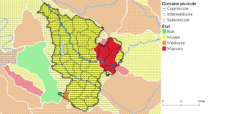 Le réseau hydrographique et son peuplement de poissons sont analysés selon le « contexte piscicole ». Le principe du découpage des cours d’eau en contexte piscicole est le suivant : dans chaque unité, une population de poissons doit pouvoir accomplir l’intégralité de son cycle vital (reproduction, croissance…). On distingue ainsi, en fonction du type de poissons, trois types de peuplement :