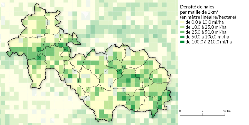 La densité de haies moyenne sur l’intercommunalité est de 16.96 ml/ha (mètres linéaires par hectare), soit 728.46 km de haies au total.