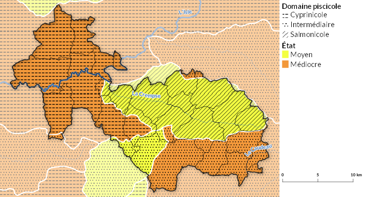 Le réseau hydrographique et son peuplement de poissons sont analysés selon le « contexte piscicole ». Le principe du découpage des cours d’eau en contexte piscicole est le suivant : dans chaque unité, une population de poissons doit pouvoir accomplir l’intégralité de son cycle vital (reproduction, croissance…). On distingue ainsi, en fonction du type de poissons, trois types de peuplement :