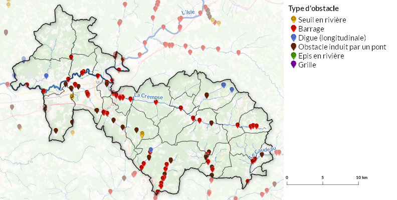 Enfin, l’interruption des écoulements superficiels, appelée assecs, est susceptible d’engendrer également la rupture de la continuité écologique procurée par le cours d’eau. Ces écoulements sont suivis par l’OFB via le réseau ONDE, et par certaines fédérations de pêche en Nouvelle-Aquitaine.
